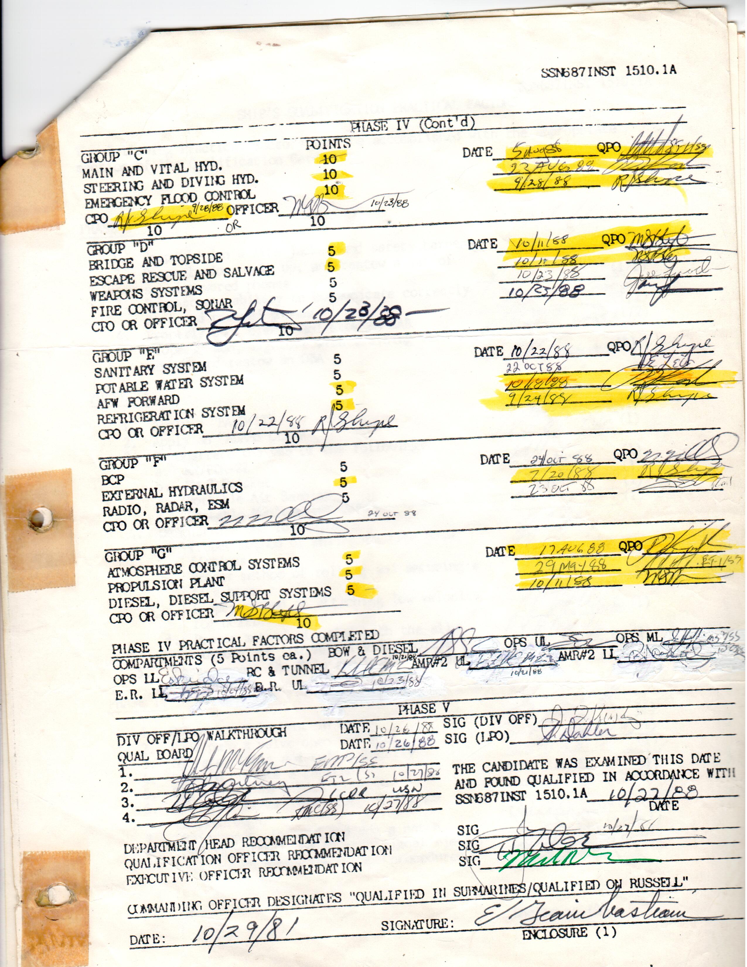 Once you’re aboard, you spend your first year “qualifying in submarines” – learning every system on the boat from stem to stern. Reactor plant, weapons systems, sonar, navigation, damage control, hydraulics, electrical – all of it. You have to be able to draw systems from memory. You have to know where all the damage control equipment and emergency breathing air hose manifolds are - blindfolded. By touch. You get quizzed by anyone senior to you, any time, anywhere. The process requires that a fully qualified submariner personally sign your “qualification card” for every single item of knowledge. And there are a lot of items.
